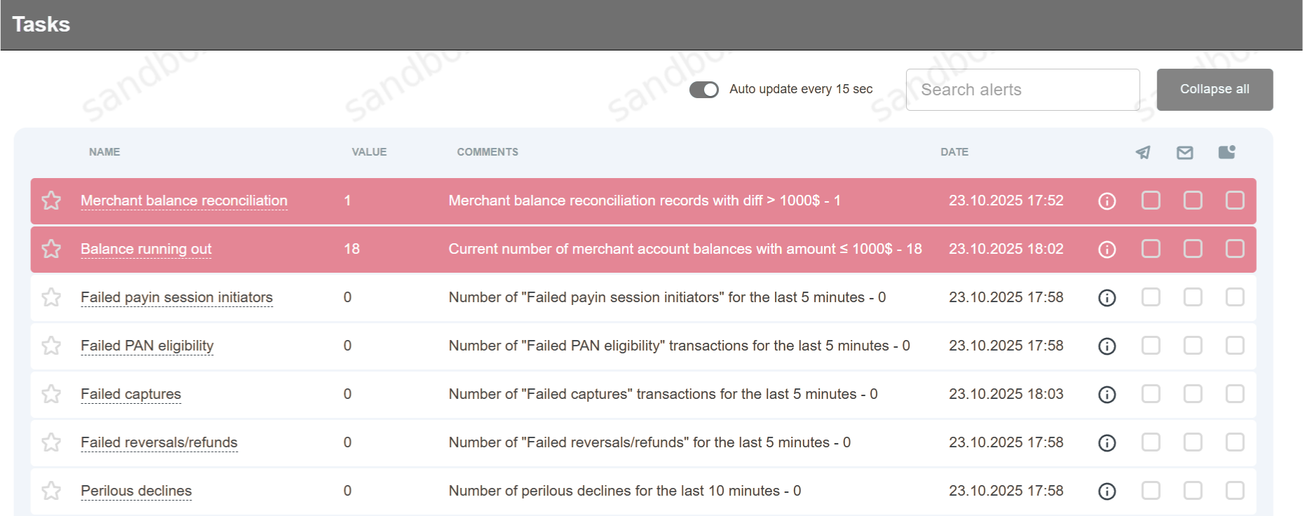 Уведомления могут быть созданы для случаев, когда транзакции были отфильтрованы по одному из следующих фильтров: